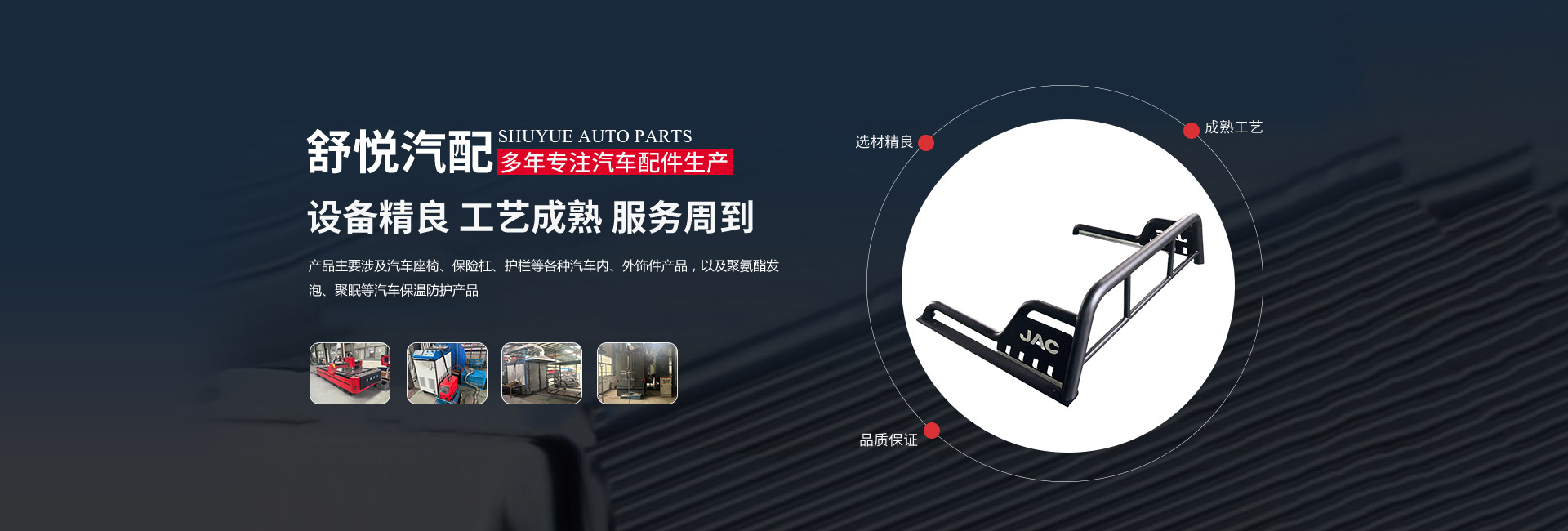 揚(yáng)州舒悅汽配有限公司經(jīng)過(guò)多年的穩(wěn)定發(fā)展,業(yè)績(jī)一直蒸蒸日上。公司產(chǎn)品主要涉及汽車座椅、保險(xiǎn)杠、護(hù)欄等各種汽車內(nèi)、外飾件產(chǎn)品,以及聚氨酯發(fā)泡、聚脲等汽車保溫防護(hù)產(chǎn)品。其主要是為江淮、金龍,奇瑞等公司服務(wù),已連續(xù)多年成為江淮、金龍等公司的A級(jí)供應(yīng)商。        公司成立于1997年,現(xiàn)坐落于揚(yáng)州市儀征劉集盤(pán)古工業(yè)集中區(qū)202號(hào),公司占地面積26640平 方米,廠房建筑面積18512平方米。公司擁有先進(jìn)的制造設(shè)備、可靠的生產(chǎn)工藝、完善的檢測(cè)手段和科學(xué)的管理,在售前和售后服務(wù)中做到快速反應(yīng),應(yīng)急應(yīng)變,為客戶提供優(yōu)良產(chǎn)品和滿意服務(wù)。公司的產(chǎn)品開(kāi)發(fā)能力和生產(chǎn)規(guī)模在同行業(yè)中處于前列的地位。        揚(yáng)州舒悅?cè)吮小罢\(chéng)信雙嬴”的原則,發(fā)揚(yáng)“誠(chéng)信、務(wù)實(shí)、創(chuàng)新、貢獻(xiàn)”的企業(yè)精神,恪守“顧客至上”的經(jīng)營(yíng)宗旨,致精從業(yè),不斷引進(jìn)新技術(shù)、新材料。以優(yōu)良的產(chǎn)品、合理的價(jià)格和周到的服務(wù)參與市場(chǎng)競(jìng)爭(zhēng)。公司愿與國(guó)內(nèi)外朋友建立真誠(chéng)的合作伙伴關(guān)系,攜手共創(chuàng)輝煌!